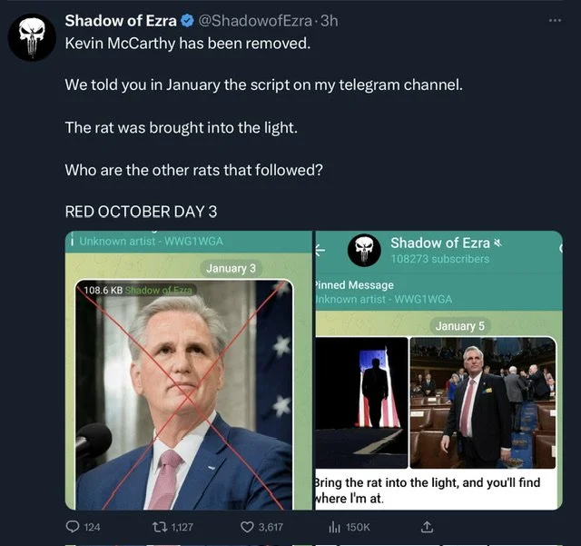 In the news for Tuesday October the 3rd, 2023 VIDEOS/ SHOWS around the U.S. Around the WORLD In the FINANCIAL realm WHAT WAS DONE IN THE DARK IS COMING TO THE LIGHT REAL RAW NEWS STRIKING? Our Words of Wisdom are sponsored by ALLYKAT IN KEVIN MCCARTHY NEWS…. TRUMP Say what day is it today? Remember to click the photos… most have links to actual videos, social media posts or articles LINQS Q ALERTS FOR OCT. 3rd Interesting tidbits England, Justice, Civil Rights, The Storm, The Great Awakening, in the newsKorie SchultzOctober 3, 2023australia one, uaw strike, singapore, china, ever grande, legal claims, britons, tiffany and company, tokyo, switzerland, blockchain, bank of america, bofa, real raw newsComment Facebook0 Twitter 0 Likes